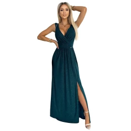 Dlouhé dámské šaty v lahvově zelené barvě s výstřihem a rozparkem na noze model 18568266 - numoco