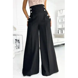 Elegantné široké nohavice s vysokým sedom a zlatými gombíkmi. Sú vyrobené z hladkej matnej tkaniny v čiernej farbe. Značka Numoco. Poľský výrobok.