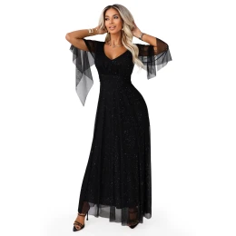 Dlouhé lehké třpytivé šaty s výstřihem a rukávy černé model 21802210 - numoco basic