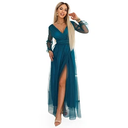 Maxi šaty Numoco Basic v lahvově zelené barvě s tylovou vrstvou, obálkovým výstřihem do V, průhlednými dlouhými rukávy a rozparkem. Evropská výroba. Ideální na svatbu, ples, Silvestra a elegantní večírek.