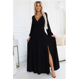 Šaty Numoco NELA sú elegantné dlhé šaty s rozparkom na nohách a voľnými dlhými rukávmi. Šaty majú vpredu výstrih do V a vzadu zmyselný dekolt. Sú vyrobené z lesklej čiernej elastickej látky, ktorá dokonale zvýrazňuje siluetu. Poľský výrobok, ideálny na špeciálne príležitosti.