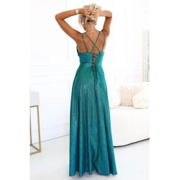 Dlouhé třpytivé večerní šaty s rozparkem na nohou a korzetovým spojením na zádech - lahvově zelené