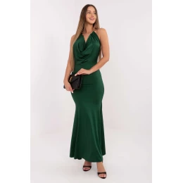 Elegantní maxi šaty ve smyslném střihu syreny, skvělý na společenské události a večírky, kde záleží na eleganci a efektním vzhledu. Vyrobené z převažující směsi polyesteru a viskózy jemně obepínají postavu, zdůrazňují její tvary a zároveň zajišťují pohodlí při nošení. Model okouzluje hladkým, minimalistickým vzorem, který dodává kreaci eleganci a nadčasový charakter. Šaty jsou bez rukávů a upoutávají pozornost hlubokým, tekoucím výstřihem, který vytváří elegantní linii a jemně zdůrazňuje ramena. Výjimečným prvkem je upevnění šatů na krku pomocí kovového kroužku, který slouží jak k dekorativní, tak k praktické funkci. Díky absenci tradičního zapínání se šaty jeví mimořádně plynule a moderně, přičemž jejich forma zůstává nepoznamenána dalšími prvky. Je to ideální volba pro ženy, které touží vyniknout elegancí spojenou s moderní a odvážnou linií.