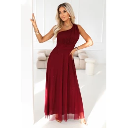 Tato šaty, ve kterých nemusíte dělat dojem. Hluboká bordová barva, jemný lesk a smyslný střih na jedno rameno dělají z toho, že stačí jeden krok a celý večer bude o vás. Bordové večerní maxi šaty jsou vyrobeny z lehkého, polotransparentního materiálu s jemným brokátovým efektem, na měkkém podšívce. Drapovaný vršek na jedno rameno plynule přechází do jasně vyznačeného pasu zdůrazněného širokým vázáním. Vzdušná, vrstvená sukně se krásně skládá při pohybu, vlní se s každým krokem a otočkou na parketu. Tento střih jemně zúžuje postavu: prodlužuje nohy, tvaruje pas, skrývá drobné nedokonalosti v oblasti břicha a boků. Je to ideální šaty na svatbu, maturitní ples, ples, vánoční večírky a všechny důležité události, na kterých chcete vypadat elegantně, ale cítit se pohodlně po celou noc. Evropská výroba.