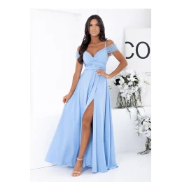 Elegantní maxi šaty v modré barvě, vytvořené s ohledem na výjimečné události. Model s ženským, přiléhavým střihem, který krásně zdůrazňuje pas a zjemňuje postavu. Horní část šatů ohromuje záhybovým výstřihem ve tvaru písmene V, který jemně zdůrazňuje poprsí. Odkryté ramena zdobí jemné, flitrové rukávy, které dodávají celku lesku a večerního charakteru. Tenká ramínka zajišťují stabilitu a pohodlí nošení. V pasu je použit ozdobný pás s flitrovým zakončením, který efektně zdůrazňuje proporce postavy. Dlouhá, lehce rozkročená sukně vyrobená z tekoucího materiálu se krásně usazuje při pohybu, a vysoké rozparky na noze přidávají smyslnost a lehkost. Šaty se zapínají vzadu na zakrytý zip, což zaručuje ideální přizpůsobení a estetické dokončení. Ideální volba na: svatbu, ples, maturitní ples, oslavu, elegantní večerní výstupy.
