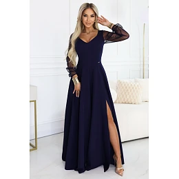 Tieto jedinečné tmavomodré maxi šaty značky Numoco v sebe spájajú klasickú eleganciu s moderným spracovaním, ktoré upúta pozornosť už na prvý pohľad. Hladký, dokonale padnúci vrchný diel krásne zvýrazňuje pás, zatiaľ čo rozšírený spodný lem zaručuje ľahkosť a voľnosť pohybu. Priehľadné sieťované rukávy dodávajú kreácii jemnú zmyselnosť, pričom si zachovávajú nadčasový charakter. Ide o dokonalý dizajn na svadbu, ples, maturitný ples, galavečer, Silvester alebo večerné stretnutie. Šaty vyzerajú veľmi efektne v pohybe aj na fotografiách a vytvárajú styling, ktorý dlho zostane v pamäti. Ak hľadáte šaty, v ktorých sa budete cítiť elegantne, sebavedomo a skutočne jedinečne, tento model bude skvelou voľbou. Vyrobené v Poľsku.