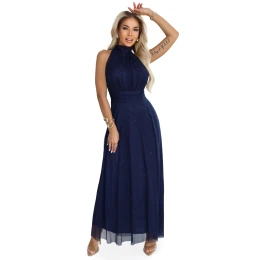 Veronica je jedinečnou nabídkou pro ženy, které chtějí vyniknout elegancí a noblesou i při těch nejvýznamnějších příležitostech. Dlouhé maxi šaty v námořnické modři byly vyrobeny z lesklého materiálu, který se na světle krásně třpytí a podtrhuje elegantní charakter kreace. Horní díl s působivým stojáčkem a jemným řasením opticky zeštíhluje siluetu, zatímco mírně rozšířená spodní část dodává lehkost a výjimečný půvab.