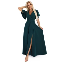 Jennifer - dlouhé maxi šaty v lahvově zelené barvě s obálkovým výstřihem, volnými rukávy a vysokým rozparkem na noze. Polský výrobek, značka Numoco.