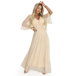 Šampanově béžové maxi šaty s průhlednými rukávy a zavazováním v pase - Numoco Basic