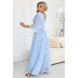 Šaty mají obálkový přední díl s výstřihem do V a široké, volné rukávy v délce 3/4 z lehké poloprůhledné síťoviny. Pas je zvýrazněn širokým páskem, na zádech je vázačka pro úpravu lemu a dlouhá maxi sukně má nahoře jemně třpytivou tylovou vrstvu a podšívku.