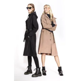 Kabát má podšívku, tři kapsy a zapíná se patentkami. Model má pásek s přezkou. Kabát má délku ke kolenům.