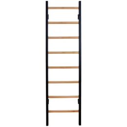 Drewniano – metalowa drabinka gimnastyczna to solidna i praktyczna konstrukcja. Nie zajmuje dużo miejsca, jest przymocowana do ściany i odstaje na około 15 cm, dzięki czemu znakomicie sprawdzi się w każdym pomieszczeniu. Nowatorskie połączenie drewna z metalem idealnie komponuje się w aktualne trendy nowoczesnego wystroju wnętrza. Profile boczne drabinki gimnastycznej zostały wykonane z metalu 40 x 50 mm o grubości stali – 2 mm. Metal wykorzystany w produkcji jest wysokiej jakości, a proszkowe malowanie zabezpiecza profile drabinki przed odpryskami, zarysowaniami czy zadrapaniami wynikłymi z użytkowania drabinki i kontaktu z osprzętem. Amortyzacja w kształcie litery T uchwytów do ściany skierowana jest na duże obciążenia, nawet do 150 kg osoby ćwiczącej na drabince gimnastycznej. Szczebelki wykonane są z drewna bukowego, są one ręcznie olejowane co zapobiega ślizganiu się dłoni podczas wykonywania ćwiczeń na drabince gimnastycznej. Chroni to także drabinkę przed szybką eksploatacją w postaci śladów, otarć czy zabrudzeń.