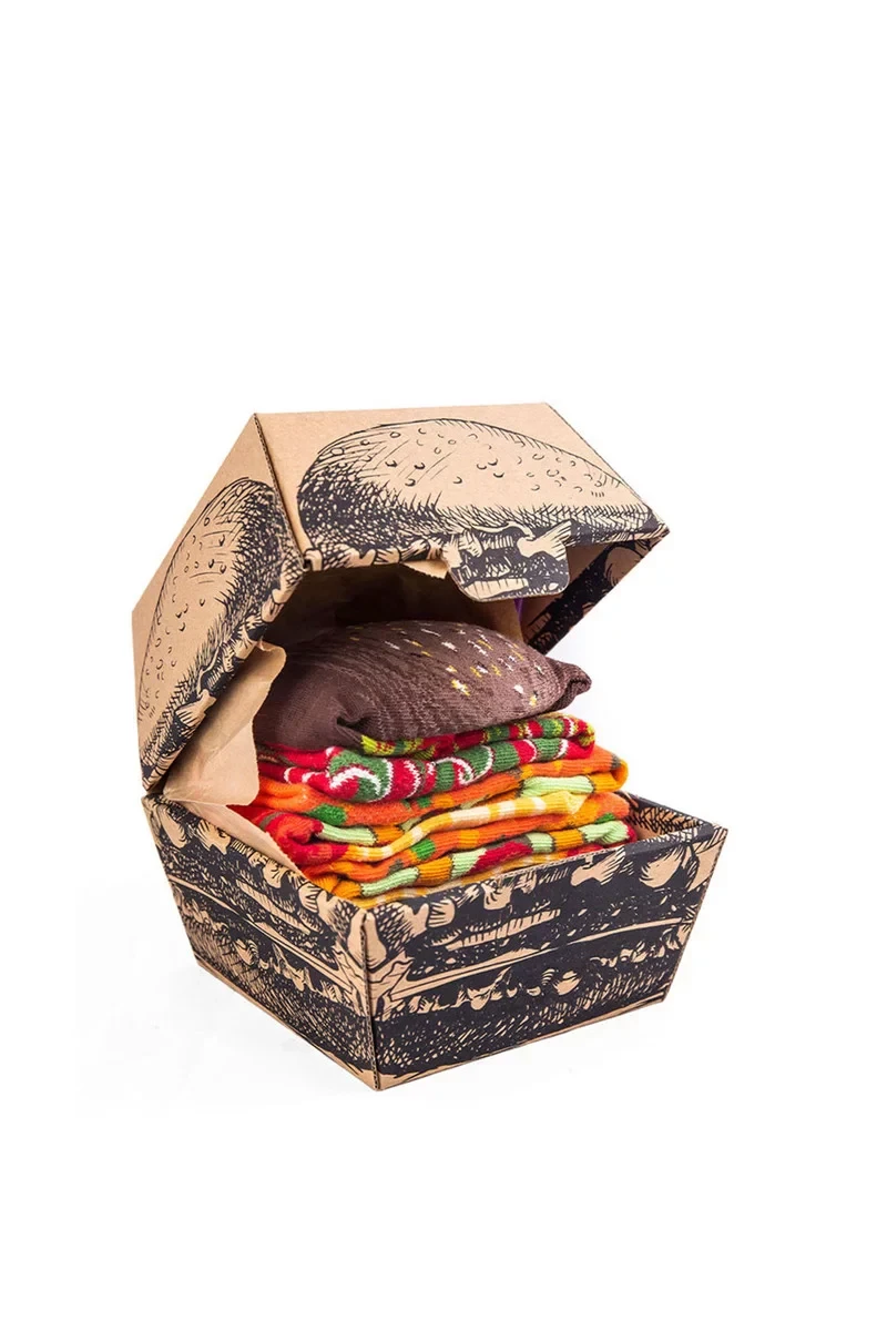 vegánsky burger je zábavným prekvapením pre každého vegánskeho gurmána. Ponožky sú zabalené v papieri a škatuli, takže vyzerajú ako z vegánskeho hamburgeru. Krabica je vyrobená z hnedého kartónu, ktorý nie je potiahnutý fóliou. Dajte svojmu hladnému priateľovi ponožkový hamburger a sledujte jeho prekvapenú tvár, keď uvidí, čo je vnútri. Ponožkový hamburger je najneobvyklejšia náhrada mäsa, akú kedy svet videl!