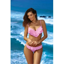 Jemné, veľmi ženské dvojdielne plavky s okúzľujúcimi volánikmi: Matylda M-469.Tieto plavky vám prepožičia výnimočný šarm (a navyše vám umožní zabudnúť na prípadné komplexy). Má skvelý strih. Bol vyrobený pre malé a stredné poprsie - dobre zbiera, tvaruje a dvíha prsia a výrazne ich zväčšuje. Výstrih získa pôvab, sex-appeal a vy maximálnu ženskosť. Jej tajomstvo? - sú košíčky vystužené jemnou penou, s kosticami a pomerne veľkou push-up výplňou, ktorá je tentoraz umiestnená trvalo vo vnútri podprsenky. Volániky vo výstrihu sú jedným z hlavných trendov leta. Ramienka sú nastaviteľné a obvod sa vzadu zaväzuje. Dopĺňajú ich koketné nohavičky, rovnako s volánikom. Plavky sú vyrobené z krásnej talianskej tkaniny Carvico a dodávajú sa v rade atraktívnych plážových farieb. Vyberte si ju vo svojom obľúbenom!