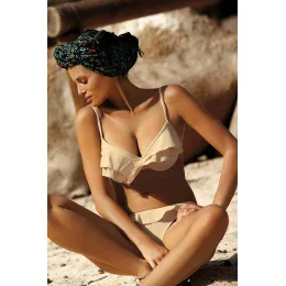 Jemné, veľmi ženské dvojdielne plavky s okúzľujúcimi volánikmi: Matylda M-469.Tieto plavky vám prepožičia výnimočný šarm (a navyše vám umožní zabudnúť na prípadné komplexy). Má skvelý strih. Bol vyrobený pre malé a stredné poprsie - dobre zbiera, tvaruje a dvíha prsia a výrazne ich zväčšuje. Výstrih získa pôvab, sex-appeal a vy maximálnu ženskosť. Jej tajomstvo? - sú košíčky vystužené jemnou penou, s kosticami a pomerne veľkou push-up výplňou, ktorá je tentoraz umiestnená trvalo vo vnútri podprsenky. Volániky vo výstrihu sú jedným z hlavných trendov leta. Ramienka sú nastaviteľné a obvod sa vzadu zaväzuje. Dopĺňajú ich koketné nohavičky, rovnako s volánikom. Plavky sú vyrobené z krásnej talianskej tkaniny Carvico a dodávajú sa v rade atraktívnych plážových farieb. Vyberte si ju vo svojom obľúbenom!