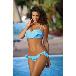 Krásne dvojdielne plavky zdobené módnymi, vzdušnými volánikmi tejto sezóny. So zlatou mašľou uprostred výstrihu. Brazílsky strih dna. Ak snívate o veľkých, pevných a sexy prsiach, krásne stiahnutých do výstrihu - tento návrh je presne pre vás. Plavky vyzerajú sladko a nevinne, sú k dostaniu v mnohých atraktívnych farbách a každé z nich je vyrobené zo skvelej, mäkkej a elastickej látky. Podprsenka sa vyznačuje skvelou konštrukciou určenou pre menšie a stredne veľké prsia - je vystužená a má pomerne veľkú push-up výplň, ktorá je v podprsenke trvalo umiestnená. Nastaviteľné, odnímateľné ramienka, ideálne na opaľovanie tela. Obvod sa zapína sponou. Nohavičky sú sexy, na bokoch zaviazané podprsenky s volánikom v hornej časti. Pre dokonalý efekt by mal byť spodný diel pritiahnutý k hornej časti bokov tak, aby jeho trojuholníkový tvar pekne zdobil spodný diel, ktorý čiastočne presahuje obrys spodného dielu.
