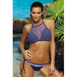 Ak sa nemôžete rozhodnúť, či chcete na pláži leňošiť, alebo byť aktívny s priateľmi, sú tieto plavky presne pre vás. Ide o dvojdielnu podprsenku v podobe módneho topu. Horný diel pokrytý prelamovanou sieťovinou skrýva trojuholníkové košíčky, ktoré vychádzajú zo strihu sexy bikín. Sú polstrované, s bočným podvinutím a trvalo umiestnenou push up výplňou. Vďaka tomu prsia vyzerajú fenomenálne krásne - sú zdvihnuté, tvarované, blízko dekoltu a opticky zväčšené. Ramienka aj obvod podprsenky sa pohodlne zaväzujú. Skvele sa hodí aj ako súčasť plážového šatníka - so šortkami vyzerá jednoducho úchvatne. Otvorený sieťovaný spodný diel bikín sa zaväzuje na bokoch, je sexy a dokonale ladí s podprsenkou.