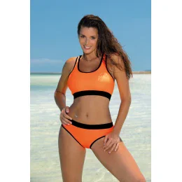 Dvojdielne plavky z talianskej tkaniny Carvico Tessuti. Podprsenka bez push-up, v podobe elastického topu. Podprsenka s odnímateľnými vložkami, ramienka nie sú odnímateľné a nastaviteľné. Nohavičky s malou elasticitou, hladký, pohodlný strih. Kostým je podšitý, zabalený vo vrecku.