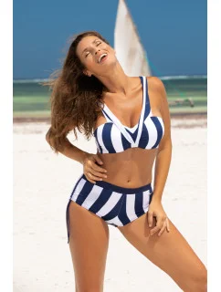Dvojdielne plavky ideálne pre malé a stredné poprsie. Push-up strednej veľkosti neodnímateľný z modelu. Ramenné popruhy širšie, prispôsobené veľkosti. Nízke elastické nohavičky so sťahovacími šnúrkami. Vyrobené z talianskej tkaniny Carvico Tessuti. Poľský výrobok. Tip: objednajte si o číslo väčšiu veľkosť ako obvykle.