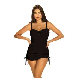 Tento módní a elegantní plážový set ve stylu tankini, který se skládá z trička a spodního dílu, vypadá naživo nádherně. Model zaujme dokonalým zpracováním, ideální pro elegantní ženu, která ocení klasiku a pohodlí. Výrazné detaily vytvářejí jedinečný styl. Košilka má na bocích šňůrky, které umožňují řasení a úpravu délky. Podprsenka bardotka bez kostic, s vyztuženými termoformovanými košíčky a speciální gumou pod poprsím, poskytuje vynikající oporu. Funkčnost dodávají boční kostice a nastavitelná, vpředu odepínatelná ramínka. Kalhotky, které jsou součástí balení, mají vyšší stoupání. Plavky jsou vyrobeny z vysoce kvalitního, rychleschnoucího materiálu odolného vůči chlóru a slunečnímu záření, jsou ideální k bazénu i na pláž a dokonale se přizpůsobí postavě.