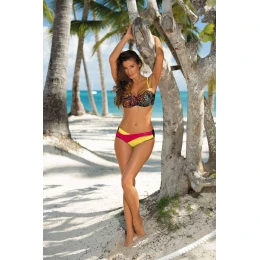 Farebné dvojdielne plavky Margaret M-377, v ktorých sa budete na pláži cítiť skvele! Podprsenka má vystužené košíčky pokryté pekným tlačeným vzorom v krásnych exotických farbách. V dolnej časti (aj na bokoch) sú košíčky s kosticami, ktoré tvarujú prsia. Veľkosti S, M, L, XL majú navyše vrecká na priložené (odnímateľné) push-up vložky. Vložte ich do košíčkov a vaše poprsie sa zdvihne, prsia sa k sebe priblížia a sexy sa zväčšia, čím vznikne dekolt snov. Obvod podprsenky je elastický, vzadu sa zapína na pracku. Ramienka majú nastaviteľnú dĺžku, dajú sa úplne odopnúť a pohodlne sa opaľovať. Nohavičky sú veľmi pohodlné, elastické, vzadu hladké. Farby dokonale ladia.
