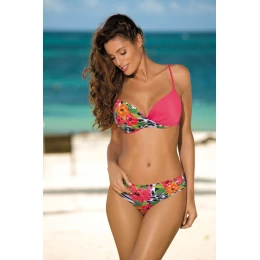 Ružové plavky, ktoré okamžite upútajú pozornosť. S exotickým kvetinovým zdobením. Sú vyrobené z kvalitnej talianskej tkaniny Carvico Tessuti. Podprsenka je vystužená, obohatená o kostice umiestnené v spodnej časti košíčkov. Menšie veľkosti, t. j. S, M, L, XL, majú prídavné (vyberateľné) push-up košíčky. Model umožňuje nadvihnúť poprsie, priblížiť prsia k sebe a atraktívne ich zväčšiť. Obvod podprsenky je elastický, so zapínaním vzadu. Veľmi pohodlné. Nastaviteľné ramienka. Kvetinové nohavičky vpredu a hladké vzadu. Klasický, pohodlný strih.