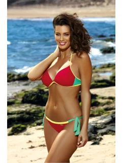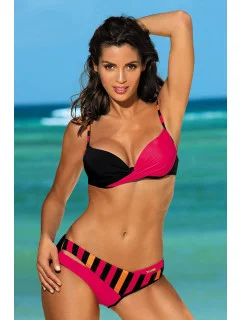 Štýlové dvojdielne plavky. Podprsenka s hladkými košíčkami dokonale prilieha k dekoltu, pevne ho zdvíha a opticky zväčšuje vďaka push-up košíčkom, ktoré sú súčasťou súpravy (a ktoré je možné v prípade potreby z modelu vybrať). Jeho ďalšou výhodou sú pôsobivé tenké ramienka vo výstrihu, ktoré vyzerajú veľmi sexy. Nastaviteľné popruhy. Obvod sa zapína sponou. Súčasťou sú pohodlné nohavičky, taktiež zdobené pruhmi okolo bokov.