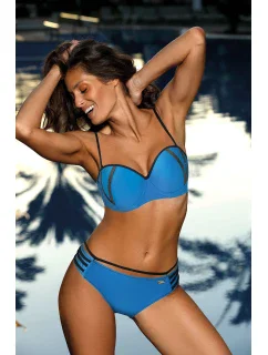 Štýlové dvojdielne plavky. Podprsenka s hladkými košíčkami dokonale prilieha k dekoltu, pevne ho zdvíha a opticky zväčšuje vďaka push-up košíčkom, ktoré sú súčasťou súpravy (a ktoré je možné v prípade potreby z modelu vybrať). Jeho ďalšou výhodou sú pôsobivé tenké ramienka vo výstrihu, ktoré vyzerajú veľmi sexy. Nastaviteľné popruhy. Obvod sa zapína sponou. Súčasťou sú pohodlné nohavičky, taktiež zdobené pruhmi okolo bokov.