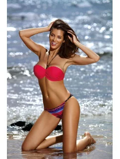 Pokiaľ máte radi vzorované kostýmy, je tu niečo pre vás. Talianska tkanina v kruhoch, veľmi pekné farby a jedinečný strih. Podprsenka dokonale zhromažďuje prsia, dvíha ich a opticky zväčšuje vďaka zabudovanej push-up výplni. Vystužené košíčky s podvinutím. Ramienka s krásnymi brošňami, zaviazané za krkom. Obvod podprsenky sa zapína na pracku.