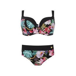 Dvoudílné plavky -vyztužená mísa s kosticemi - podprsenka z barevného mikrovlákna s květinovým potiskem - doporučeno pro velké poprsí - nastavitelná, neodnímatelná ramínka - zapínání na kovovou sponu - klasické, vzorované kalhotky, plnější - podšité vrstvou látky- odolné vůči chlóru