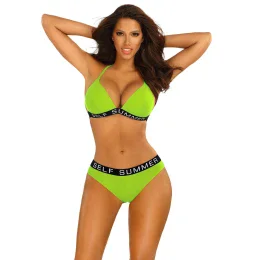 Dvojdílné plavky sportovního střihu. Podprsenka s vyztuženými tvarovanými košíčky. Ramínka zavázaná za krkem pro sadu klasických kalhotek.