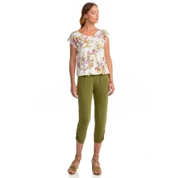 Dámske pyžamo s kvetinovým motívom pre pocit jedinečnosti a pohodlného spánku. Súpravu tvoria jednofarebné nohavice v dĺžke 7/8. Dvojdielne pyžamo je vyrobené z kvalitného mikromodalu s prímesou elastanu. Prírodný mikromodal poskytuje výnimočnú mäkkosť a pohodlie, je priedušný, pri praní sa nezráža, dobre absorbuje pot a rýchlo schne, zatiaľ čo elastan dodáva odevu potrebnú pružnosť.