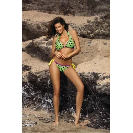 Krásne, veľmi ženské dvojdielne plavky v hráškových farbách ako z ovocného sorbetu. Podprsenka s výstrihom a'la Marilyn Monroe, vystužená as bočnými veľrybími kosticami, dokonale zhromažďuje prsia, tvaruje ich a krásne prezentuje dekolt. Dizajn je očarujúce, ženský, jemný, ale napriek tomu má charakter. Ramienka sa zaväzujú za krkom, obvod sa zapína na chrbte sponou. Nohavičky sa k podprsenke dokonale hodia, na bokoch sa zaväzujú mašličkami v šťavnatej farbe. Skvele zdobia boky a poskytujú značné pohodlie, pretože majú príjemný bokový strih. Ideálne plavky pre ženy, ktoré chcú na pláži vyzerať skvele.