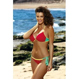 Dvojdielne plavky v krásnych tropických farbách. Jeden z najlepších modelov z kolekcie Leto 2018.Podprsenka navrhnutá pre stredné a menšie prsia, vystužená, s trvale umiestnenou push-up výplňou. Spolu s vertikálnymi veľrybími kosticami pevne približuje prsia k dekoltu, dvíha ich a opticky zvodne zväčšuje. Vytvára zmyselný dekolt. Ozdobné, kontrastné lemovanie v hornej časti podprsenky prechádza na štíhle ramienka, ktoré sa pekne zaväzujú za krkom. Obvod s vsadkami v kontrastnej šťavnatej farbe, vzadu zaviazaný. Nohavičky sú dokonale zladené s podprsenkou, hladké, sexy a zaväzujú sa na bokoch, takže vyzerajú nesmierne žensky. V týchto plavkách budete na pláži rozhodne vyčnievať!
