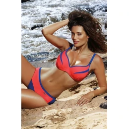 Krásne dvojdielne plavky určené pre stredné až väčšie prsia. Naozajstná lahôdka. Šikmé vsadky na košíčkoch, ľahko športový dizajn, skvelý strih a farby, ktoré navodia letnú atmosféru. Ak hľadáte niečo módne a pohodlné, ste na správnom mieste. Košíčky sú profesionálne modelované, vystužené av dolnej časti obohatené kosticami. Skvele zbierajú, zdvíhajú, držia na mieste a správne tvarujú poprsie. Vytvárajú pekný výstrih. Košíčky C a D majú dodatočné ľahké push up polstrovanie na zlepšenie telesných proporcií. Ostatné košíčky (od E do H) sú bez push up. Ramienka sú dĺžkovo nastaviteľné, obvod dobre držia, je elastický a pohodlne sa zapína na pracku.Nohavičky sú mierne vyššie, vpredu sú podšité, s kontrastným lemovaním. Vyzerajú skvele a na pláži vám určite poskytnú požadované pohodlie.