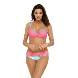 Krásne dvojdielne plavky, ktorých farba dokonale ladí so vzorom. Vyrobené z vysoko kvalitnej talianskej tkaniny. Má hladkú push-up podprsenku, ktorá zmyselne tvaruje a zväčšuje prsia a vytvára zvodný plážový dekolt. Push-up sa dodáva v každej veľkosti plaviek a nie je z modelu snímateľný. Košíčky s kosticami sú zvnútra vyplnené špeciálnou push-up penou (je k dispozícii v každej veľkosti plaviek a nie je možné ju z podprsenky vybrať). Umožňuje získať plné, ženské poprsie s maximálne prirodzeným vzhľadom. Ozdobné ramienka (pruhované) sa vzťahujú k nohavičkám. Obvod zviazaný vzadu. Nohavičky pôvabne zdobia boky a ich zadná časť ľahko odkazuje na v súčasnosti módny brazílsky strih. Edícia "Sweet & Sexy", rozhodne odporúčame!