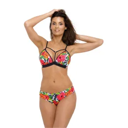Jedinečné plavky z talianskej kvetinovej látky, zvýraznené krásnymi tropickými farbami. Podprsenka má vystužené košíčky s bočnými kosticami, obohatené o push-up a širšie čierne lemovanie v spodnej časti. Umožňuje pekne zbierať, zdvíhať a opticky zväčšovať prsia. Push-up je v podprsenke trvalo umiestnený a nie je vyberateľný; je prítomný v každej veľkosti plaviek. Ďalšie neodnímateľné popruhy uprostred dodávajú celej kompozícii charakter. Obvod je pohodlne zviazaný na zadnej strane. Spodný diel brazílskeho strihu, na zadku zakončený ozdobným lemovaním. Najnovšia kolekcia na leto 2019.