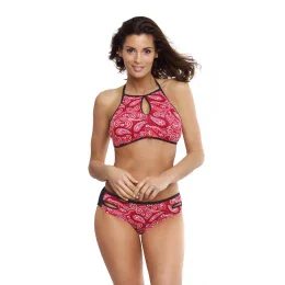 Módne a zaujímavé dvojdielne plavky so zabudovaným horným dielom. Je vyrobený zo vzorovanej matnej tkaniny. Spodná časť podprsenky má tvarované trojuholníkové košíčky vystužené penou a doplnené push-up, vďaka ktorým je poprsie správne nabrané a modelované. Push-up sa dodáva v každej veľkosti plaviek a nie je z modelu snímateľný. Podprsenka sa pohodlne zaväzuje na chrbte a za krkom. Nohavičky majú zvodné bočné záhyby. Vpredu sú vzorované, vzadu hladké a majú správnu výšku (ani príliš nízku, ani príliš vysokú), takže sa hodí na pláž. Športový štýl s nádychom etna...
