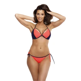 Návrh pre milovníkov farebných fenomenálnych dvojdielnych plaviek v bikinovom strihu. Viazanie za krkom, na chrbte a po stranách bokov. Sexi a veľmi ženské. Hladké košíčky s kontrastným čiernym lemovaním sú vystužené, bez push-up, dobre zbierajú a spevňujú prsia a zároveň ich približujú k sebe. Výstrih je doplnený dvoma ozdobnými pásikmi zakončenými drobnými šperkami. Zvodné nohavičky s nízkym sedom sú veľmi ženskou voľbou na pláž. Talianska tkanina.