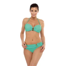 Cameron M-523 sú dvojdielne plavky v krásnej farbe, zdobené štýlovými šperkami. Podprsenka v bandeau konštrukcii má vystužené košíčky (bez push-upky) obohatené o kostice, vďaka ktorým pekne tvaruje dekolt a udržuje prsia v správnej polohe. Strih pekne zhromažďuje prsia, čo je ideálne na pláž. Opasok vedie cez krk a je odnímateľný. Plavky majú vzadu zaväzovanie na gumičku. Nohavičky sú veľmi pohodlné, predná časť je zdobená opaskom s drahokamami. Je vyrobený z vysoko kvalitnej talianskej tkaniny, vďaka ktorej vyzerá veľmi elegantne. Zvoľte si ju a dovolenka sa vám určite vydarí!
