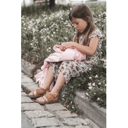 Piękne, dziecięce sandałki wykonane z eko zamszu. Osadzone na płaskim obcasie z antypoślizgową podeszwą. Zapinane na rzep z tyłu cholewki. Sandałki posiadają ozdobne paseczki i frędzle. Niezwykle przewiewny i wygodny model, który powinien znaleźć się w szafie Twojego dziecka! Przy wyborze rozmiaru prosimy sugerować się tabelą rozmiarów.
