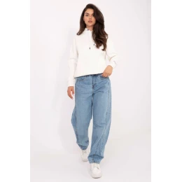 Dámske džínsy balónového strihu sú módnou voľbou na každý deň v ležérnom štýle. Sú vyrobené z kvalitnej bavlny a poskytujú pohodlie a voľnosť pohybu. Vysoký pás krásne zvýrazňuje pás, zatiaľ čo charakteristický strih s voľnejším horným dielom a zúženými nohavicami dodáva postave moderný vzhľad. Vpredu sú praktické vrecká a vzadu klasické otvorené vrecká. Model sa zapína na zips a gombík, je vyrobený z hladkého denimu, ktorý možno ľahko zladiť s mnohými každodennými outfitmi.