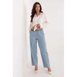 Dámske džínsy so širokými nohavicami majú módny a pohodlný dizajn v ležérnom štýle, ktorý je ideálny na každodenné nosenie. Sú vyrobené z kvalitnej bavlny, čo zaručuje pohodlie a odolnosť. Hladký vzor im dodáva univerzálny charakter, vďaka čomu sa dajú ľahko kombinovať s rôznymi kúskami oblečenia. Model s vysokým pásom krásne zvýrazňuje pás a opticky predlžuje postavu, zatiaľ čo široké nohavice zaručujú voľnosť pohybu a zodpovedajú aktuálnym trendom. Džínsy sa zapínajú na zips a gombík, čo zaručuje dobré prispôsobenie. Praktické vrecká zvyšujú funkčnosť a zapínaný pletený opasok je štýlovým doplnkom, ktorý dotvára celkový vzhľad a dodáva nohaviciam originálny charakter.
