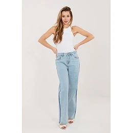 Dámské džíny s přímými nohavicemi jsou nadčasovým modelem, který skvěle padne do každodenního, ležérního outfitu. Jednoduchý střih nohavic zaručuje pohodlí a univerzální vzhled, díky čemuž jsou kalhoty snadno kombinovatelné jak se sportovními, tak s klasickými kousky šatníku. Džíny jsou vyrobeny z kombinace bavlny a elastanu, co zajišťuje, že materiál je příjemný na dotek, prodyšný a mírně elastický, což zaručuje dobré přizpůsobení se postavě a pohodlí během celého dne. Model má střední (regularní) sed, který zaručuje pohodlí a přirozené přizpůsobení v pasu. Džíny se vyznačují hladkým vzorem a jejich charakter zdůrazňují ozdobné pruhy po stranách nohavic, které dodávají moderní a módní nádech. Kalhoty se zapínají na zip a knoflík, co zajišťuje klasické a pohodlné nošení. Navíc jsou vybaveny praktickými kapsami, které zvyšují funkčnost modelu. Jsou to ideální volba na každý den do práce, pro procházku nebo s