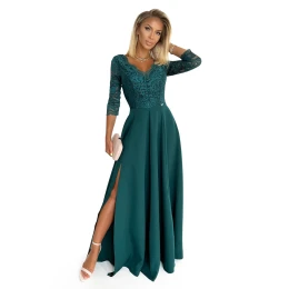 Pridanie recenzie k AMBER Elegantní dlouhé dámské krajkové šaty v lahvově zelené barvě s výstřihem model 17691306 - numoco