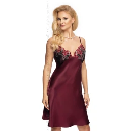Elegantná nočná košieľka pre milovníčky veľmi módneho saténu v tmavšej slivkovej farbe. Neuveriteľne zmyselná a veľmi ženská. Košíčky sú zvýraznené ozdobnou kvetinovou výšivkou. Veľmi atraktívny strih, v spodnej časti mierne rozšírený. Nastaviteľné ramienka. 97% polyester, 3% polyamid.