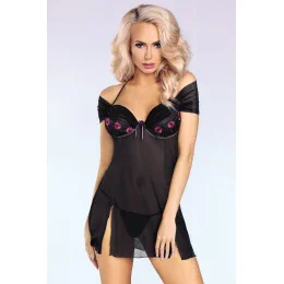 Erotická košieľka Kastalia LivCo - z najjemnejšieho tylu a čipky - košíčky zdobené čipkou - v dekolte saténová slúžka - ramienka sa zaväzujú za krkom - dĺžka košieľky pod zadoček - súčasťou sú tangá
