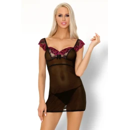 Dámska košieľka Kinga LivCo - z príjemného čierneho priesvitného materiálu - dekolt a ramienka zdobené bordovo-čiernou čipkou s kvetinovým vzorom - medzi poprsím mašlička - súčasťou košieľky sú tangá