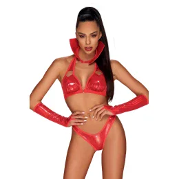 Toto ste ešte nevideli! Zahrejte si tohtoročné jesenné a zimné večery týmto sexi červeným kostýmom Vampines. Kostým je vyrobený z mäkkej, pružnej a lesklej látky, ktorá na tele vyzerá skvele. Súčasťou je podprsenka s mäkkými košíčkami v podobe topu, zapínaná vpredu medzi prsiami, tangá zaväzované nad zadok, pútavé rukavice a golier na krku.
