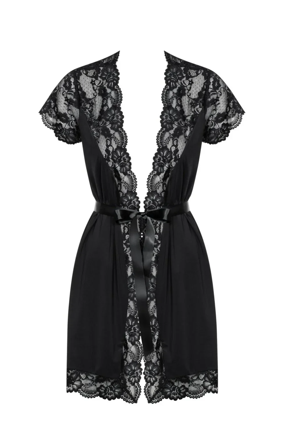 Dámsky erotický župan 810-PEI OBSESSIVE - čierny - nepriehľadný materiál a zmyselná čipka - saténový pás - podšitý pás - krátke rukávy - mäkký a elastický materiál Zloženie materiálu: 85% polyamid + 15% elastan